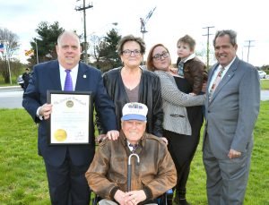 | In Prince George’s County, the iconic “Peace Cross” in Bladensburg, MD has been under legal attack by those who want to remove this long-standing memorial to PG veterans of WWI due to “establishment of religion” issues. The matter is now pending presentation to the US Supreme Court. On April 19, 2018, I attended an event at the Peace Cross to support sustaining this landmark in the county. In attendance also was Governor Larry Hogan who awarded a citation to Second Lieutenant John Robert Pedevillano – a World War II veteran, Prisoner of War, and Purple Heart recipient. The Pedevillano family ancestors were those who gave the original land for the installation of the memorial in 1919. In one of the pictures I am shown with Governor Hogan and local friends of the Peace Cross. | ||