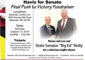 Tonight – Join voters and Havis supporters in a live telephone call-in town hall meeting. Lee Havis will be hosting this event to talk about issues of concern to everyone, and his plans, if elected to bring lower taxes and better, more accountable government for all Maryland citizens. The meeting goes from 7 to 8 PM, and if you have not received a personal invitation, you can join by calling in at 443-931-3761.